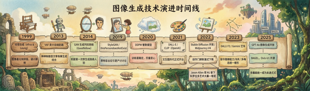 参考资料:本文技术部分参考了哈尔滨工业大学(深圳)苗嘉旭副教授的文章《从纹理合成到统一多模态:图像生成技术的30年变迁》(CSIG,2026年3月),以及 AI 小将的文章《GPT-4o生图发布之际,回顾视觉生成的发展历史》(2025年3月),在此致谢。