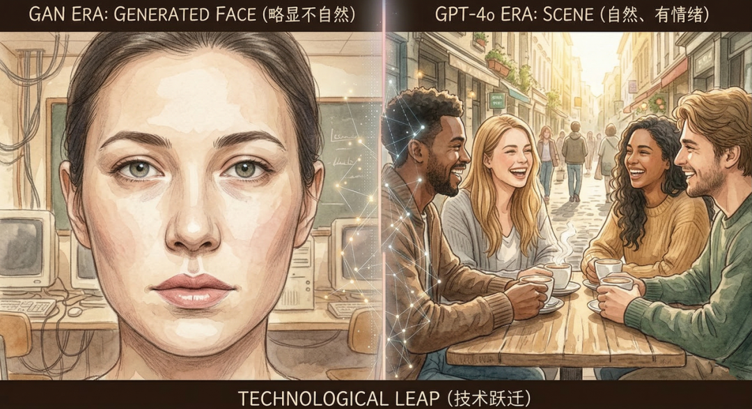 2014 年,Ian Goodfellow 提出生成对抗网络(GAN)。两个神经网络互相博弈:一个负责”造假”,一个负责”鉴别”,在不断对抗中,造假的那个越来越逼真。GAN 的出现,让机器第一次能够生成高度真实的人脸。2019 年,NVIDIA 的 StyleGAN 让这件事广为人知——网站 thispersondoesnotexist.com 让任何人都可以刷新一次,看到一张从未存在过的人脸。