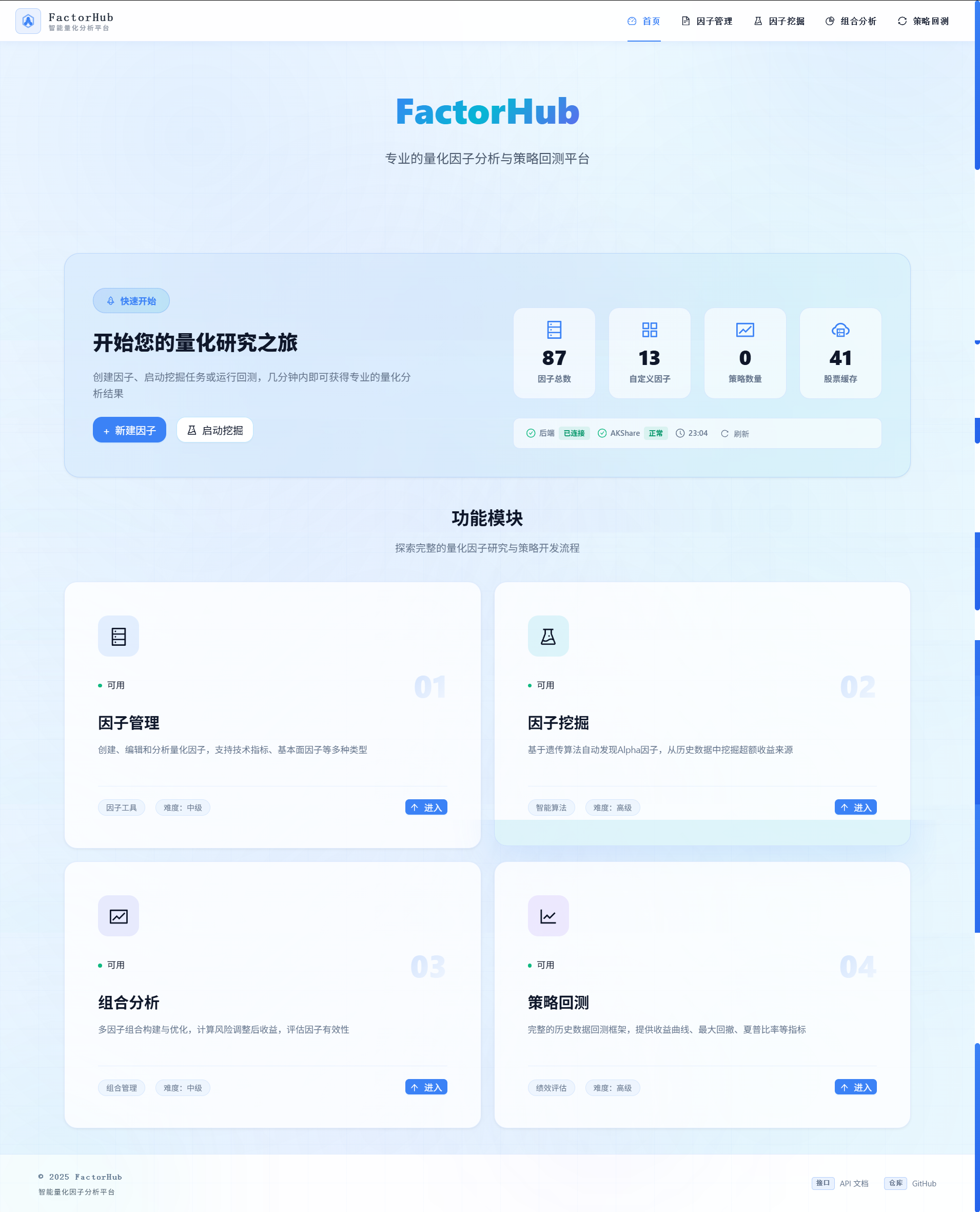 基于这个理念,FactorHub现在已经发展成一个完整的现代化量化因子分析平台,专为中国A股市场设计。它的核心价值体现在四个支柱: