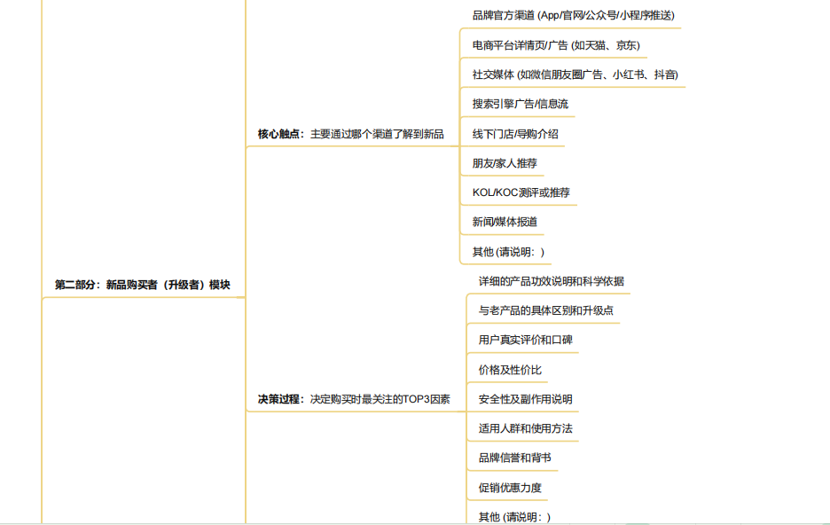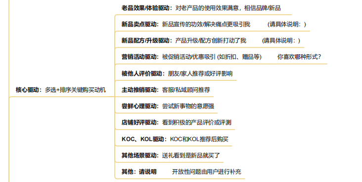 以上为通用的问卷结构设计模板,不同行业、不同产品在适配上需要结合自己的实际情况进行调优,最终核心是能够根据问卷题目的设计,得出老客有效的“人群X渠道X营销X策略”的新品升级具体可执行的落地策略。