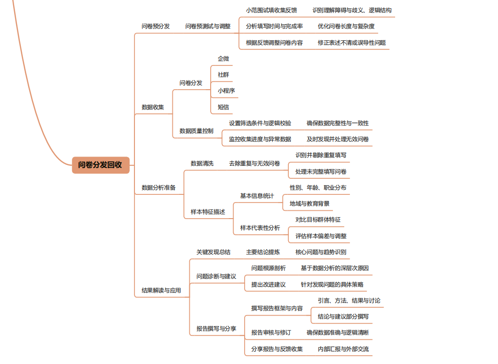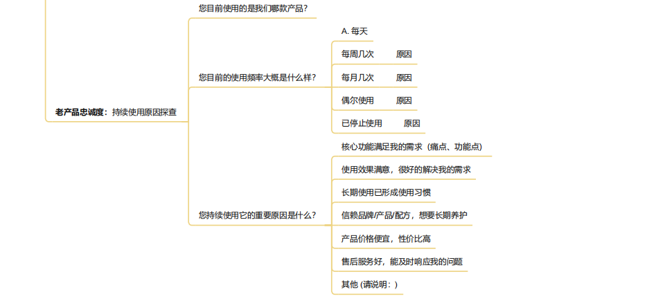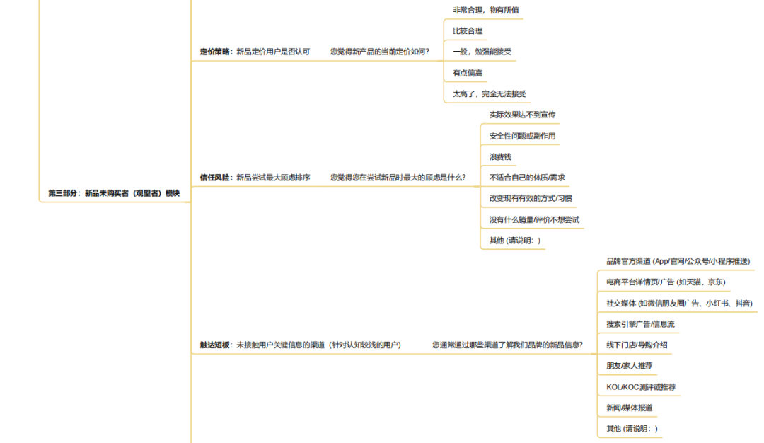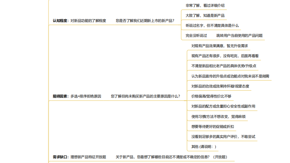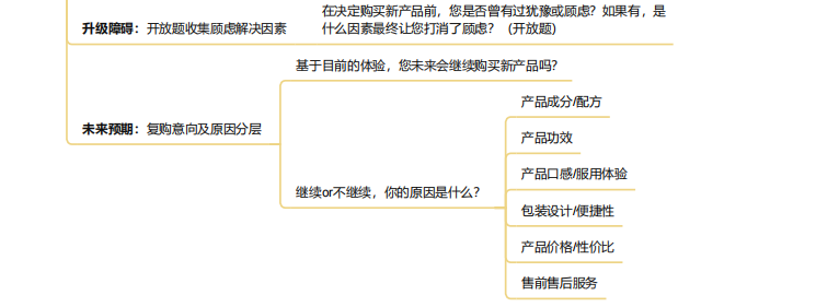 以上为老客新品不购买原因调研的基础SOP,如果遇到复杂的问题还需要针对核心目标用户进行多轮调研或者电话深度调研,最终目的是拿到核心策略方向;另外问卷设计时长、敏感信息等问卷基础问题本篇内容不涉及,完整的sop已制作成思维导图(见下方),欢迎评论区交流分享,谢谢!
