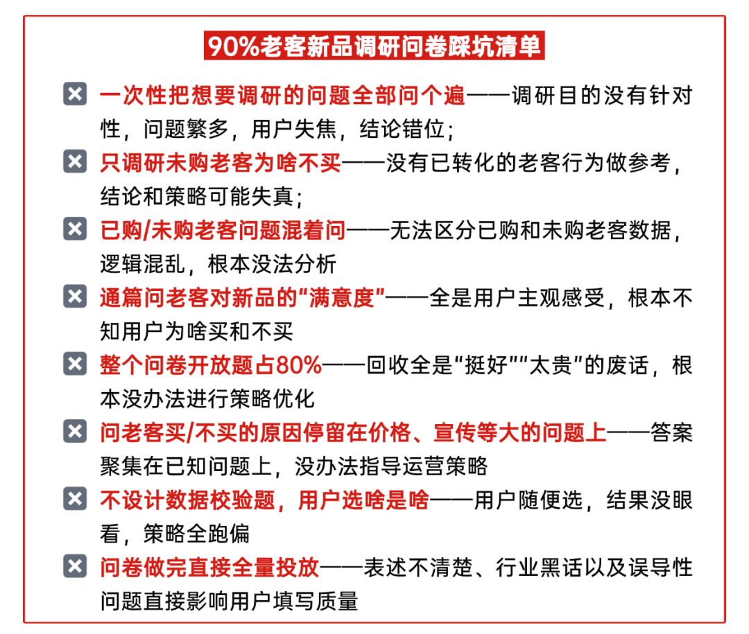 首先我们先看看,无效的老客新品购买调研问卷到底长啥样?以下为无效问卷自测清单,看看你中了几条?
