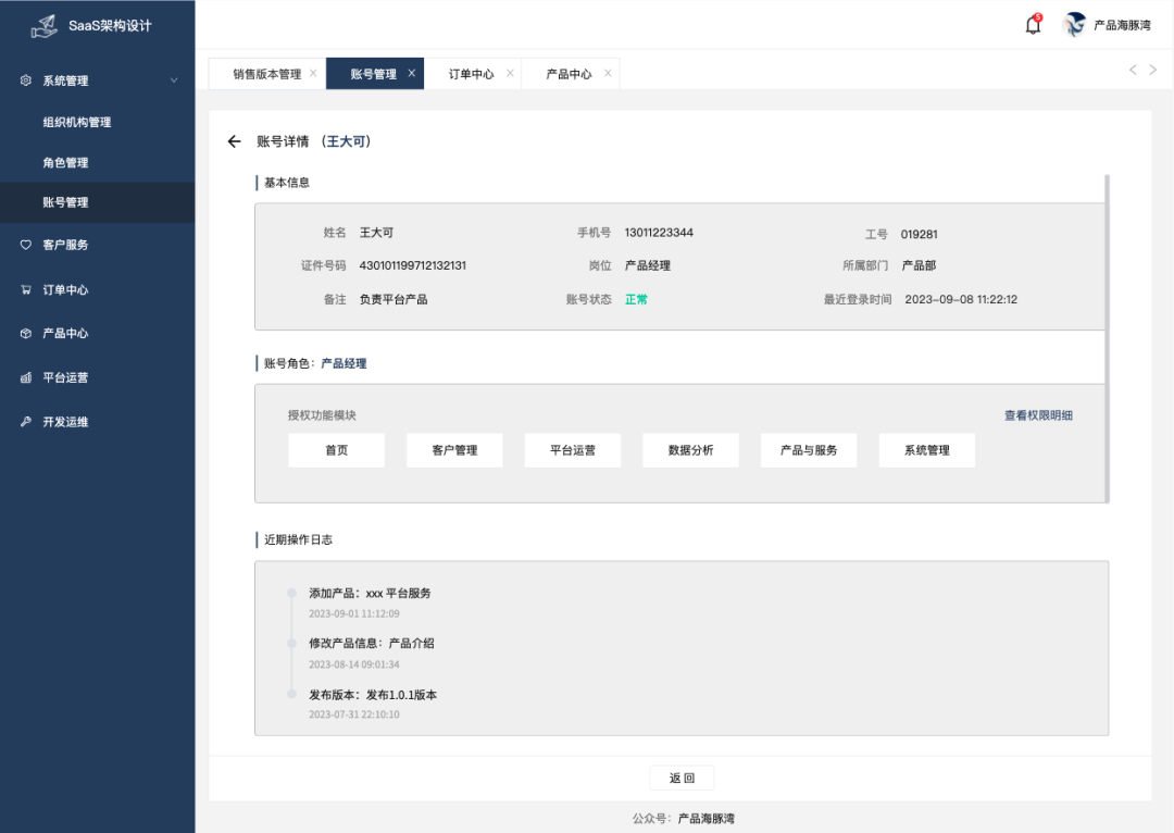 员工账号因为关联到很多数据,为了便于全面了解员工在系统中的权限、操作记录,因此员工详情中最好是能够提供业务管控所需要的全面信息,下面为一个示例的员工详情页面原型。