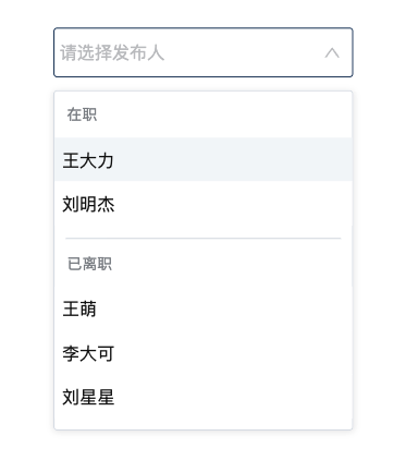 第三个是历史数据查看的问题,很多产品的设计是无法筛选出已删除人员操作的数据的,这其实不利于离职追溯。通常,在诸如添加人、最后修改人以及操作日志中,除了有人员账号的 id 之外,还需要记录操作人的姓名。这样的话,我们可以通过操作人的姓名去找到对应人员的操作记录。比如,我见过的一个场景就是一个文章管理模块,会有发布者这样一个筛选。这里就需要支持筛选出已经删除账号的发布数据。具体交互上,我们倒是可以做细化,比如将在职和离职的分组展示,如下图所示,会更加清晰。