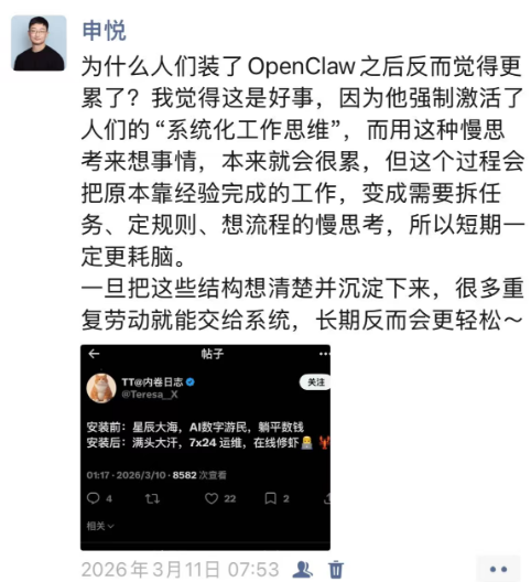 前两天我还发了条朋友圈,说要用好OpenClaw,必须强制激活自己的结构化思维,而很多人则是凭“直觉和经验”做事的,个人尚且如此,企业就更不用说了。