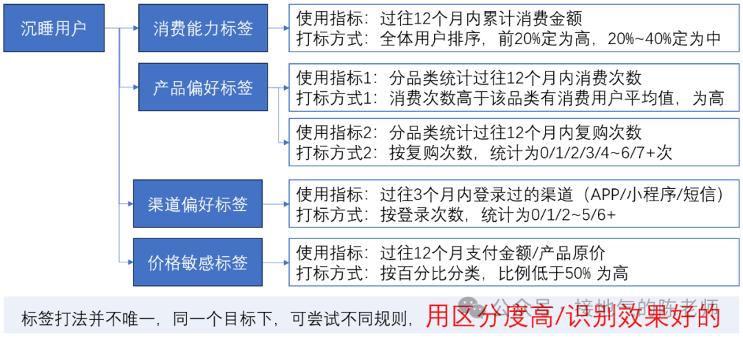 比如,业务想“召回3个月以上未消费用户”,那么初始类标签可以如下图设计,之后根据召回效果,调整标产品/渠道/价格等细节,不断提高召回成功率: