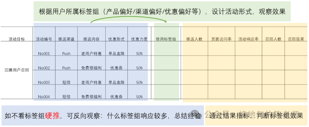 有可能,针对同一人群,业务会多次行动。此时,记录每次效果,观察何种组合能提升效果,能让用户画像越来越精准。比如“召回3个月以上未消费用户”,业务可能开展多次行动。此时记录如下图,逐步迭代,就能淘汰不好用标签,积累经验。