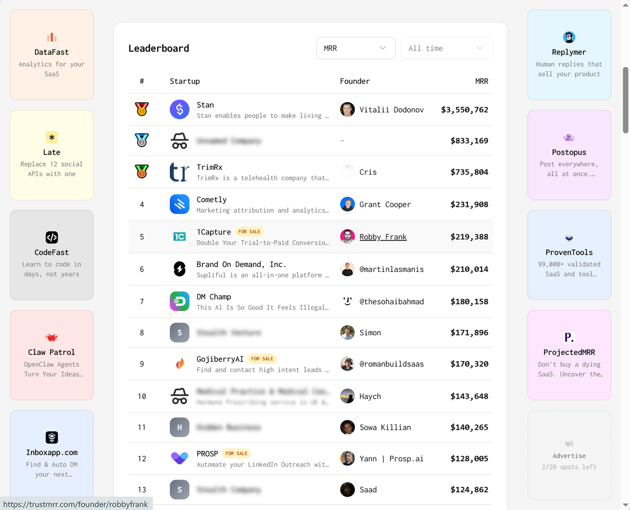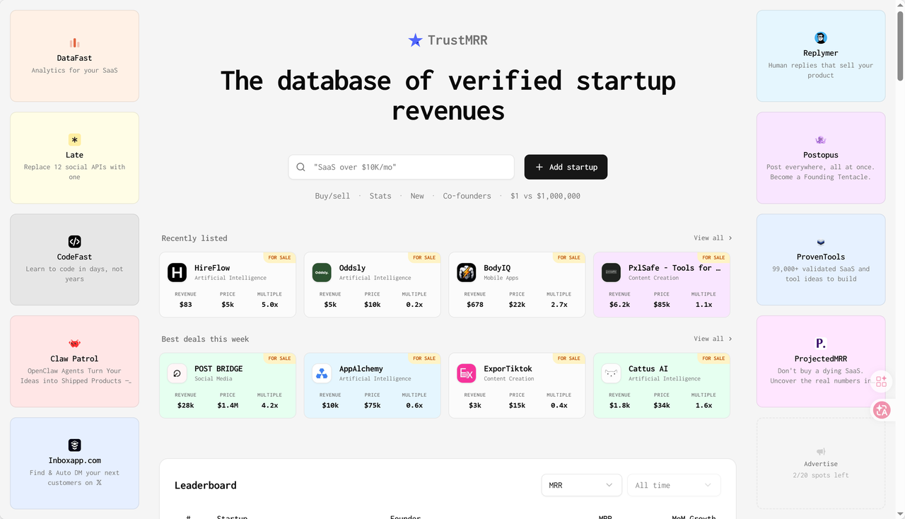 TrustMRR 早期版本几乎没有任何社交功能。没有评论区,没有点赞,没有讨论帖。就是一个榜单,干干净净。