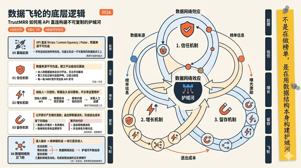 第二层是增长,每个接入的创始人相当于在持续给平台”投喂”内容,MRR 每月自动刷新,平台不需要任何运营团队去维护数据新鲜度。