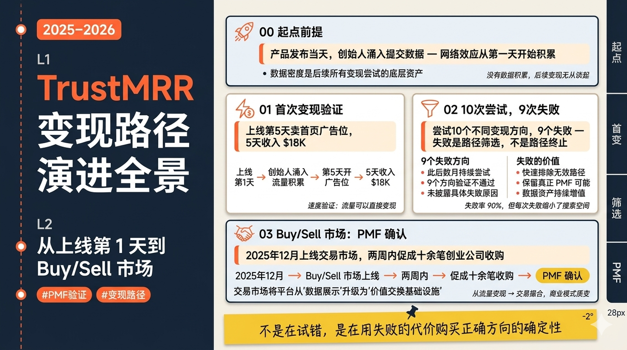 TrustMRR 的商业模式演进,是一个很典型的”流量套利 → 探索失败 → 找到飞轮”的故事。