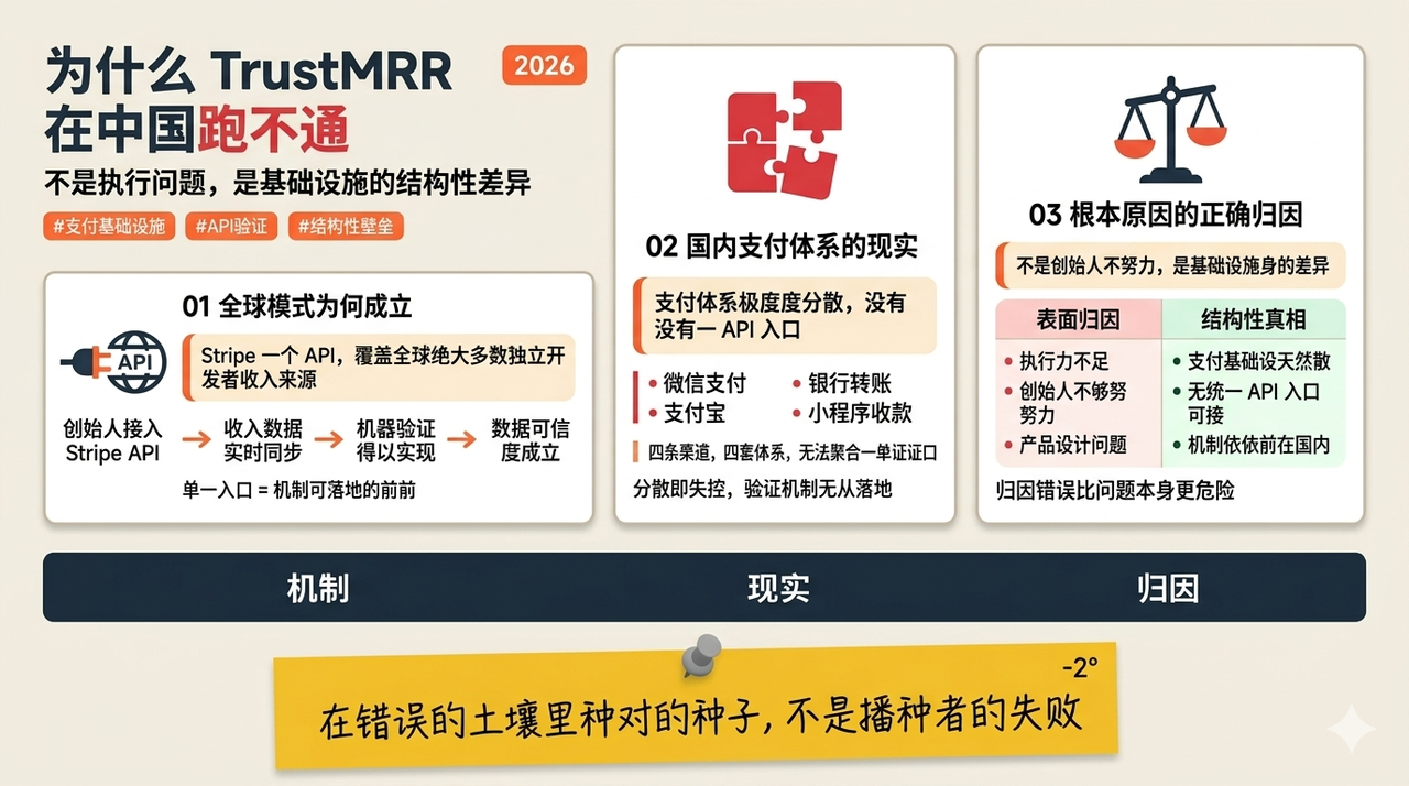 TrustMRR 的核心机制是 API 直连支付平台。Stripe 一个 API,就能覆盖全球绝大多数独立开发者的收入来源。但在国内,支付体系极度分散——微信支付、支付宝、银行转账、小程序收款……没有一个统一的 API 入口,”机器验证”这个核心机制根本无从落地。这不是创始人不努力,是基础设施本身的差异。