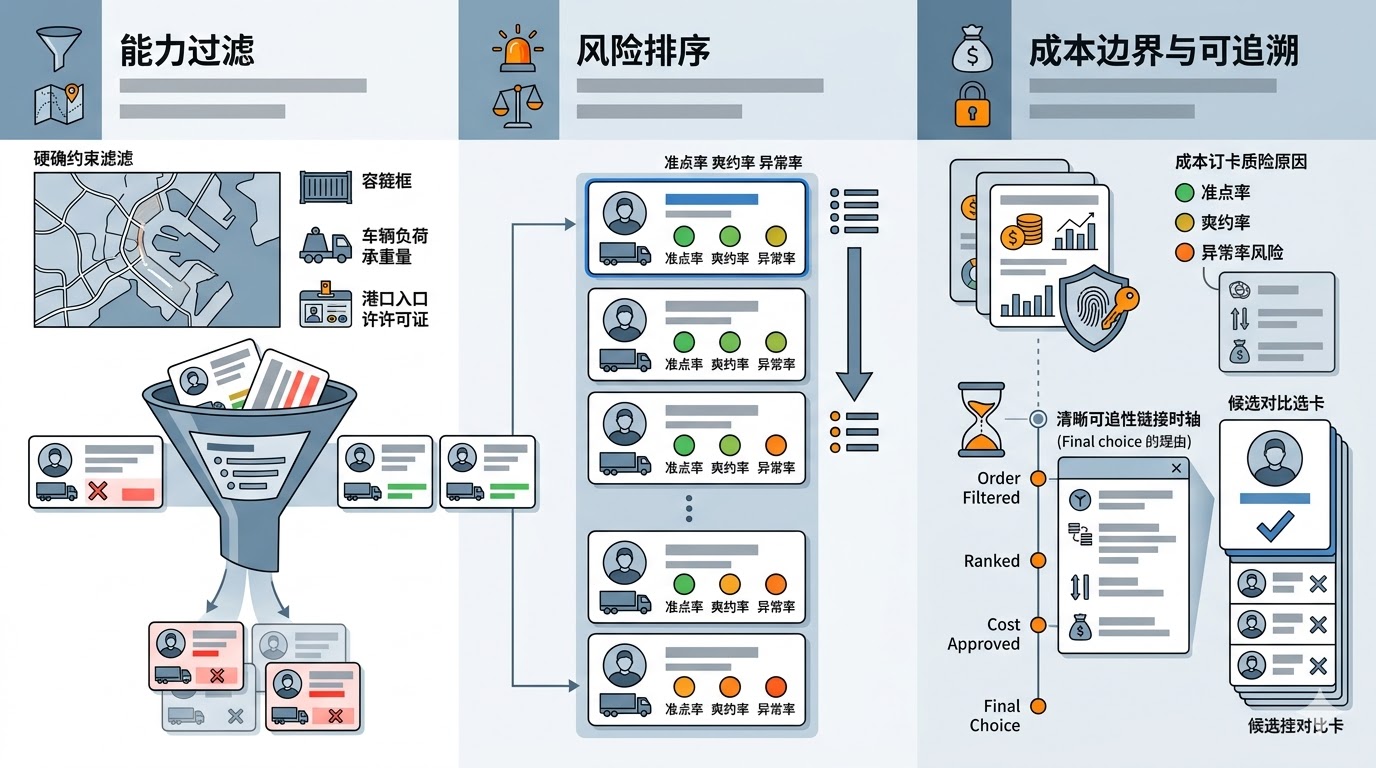 - 承运商候选集按能力过滤:满足箱架/载重/港区证等硬约束