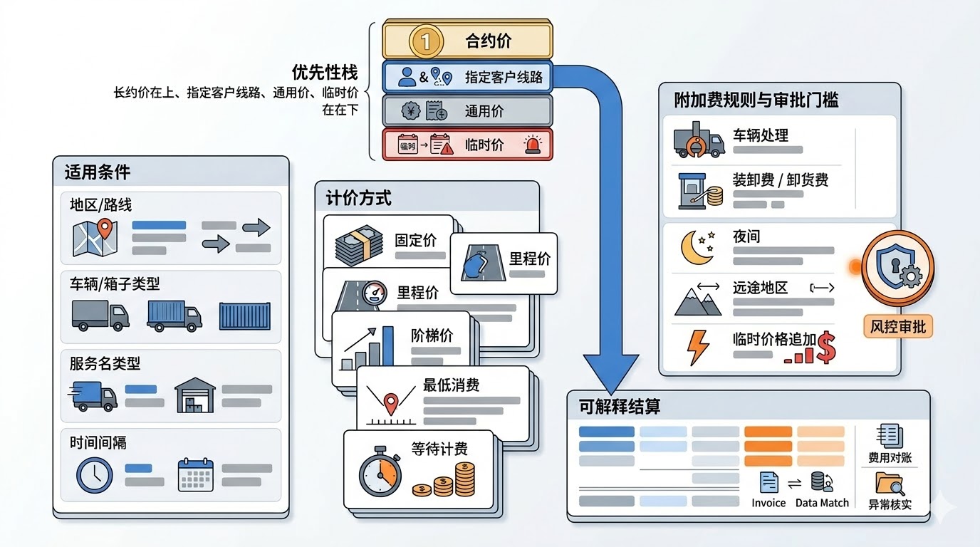 - 适用条件:区域/路线、车型/箱型、服务类型(提货/派送/进港/还柜)、时段(夜间/周末)