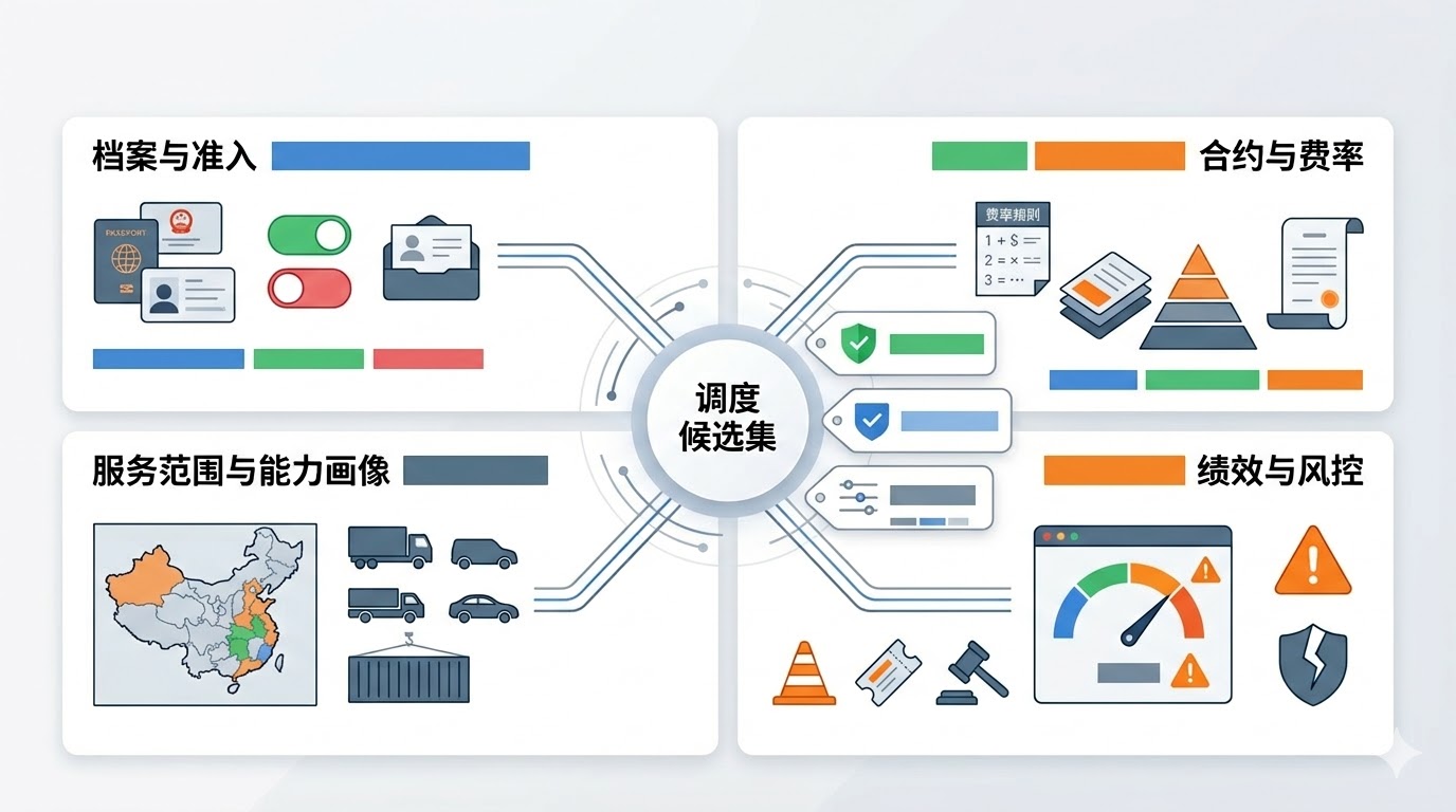 调度模块需要的不是“承运商通讯录”,而是“可用且可信的候选集”。