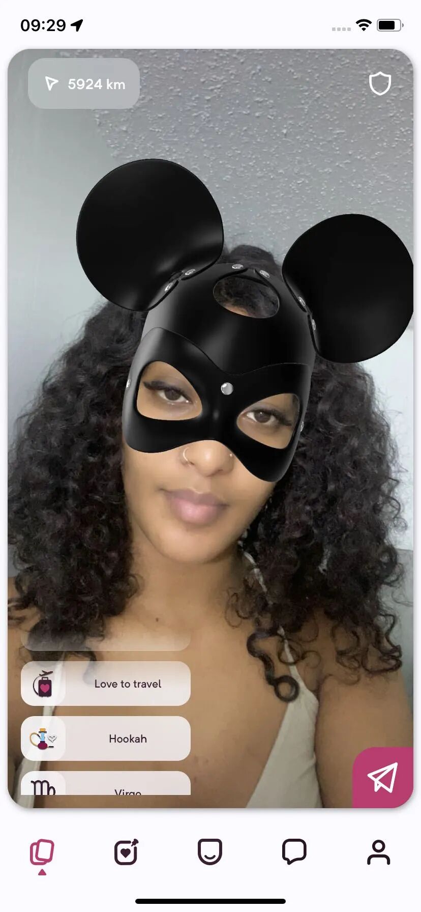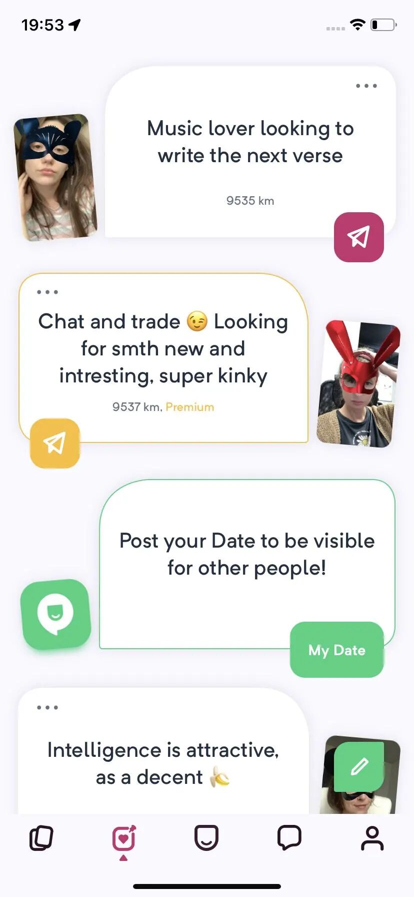 PeekUp 和 Tinder 最大的不同在于:首页滑动的卡片上的真人照(当场拍摄),全部戴着可自定义的面具。