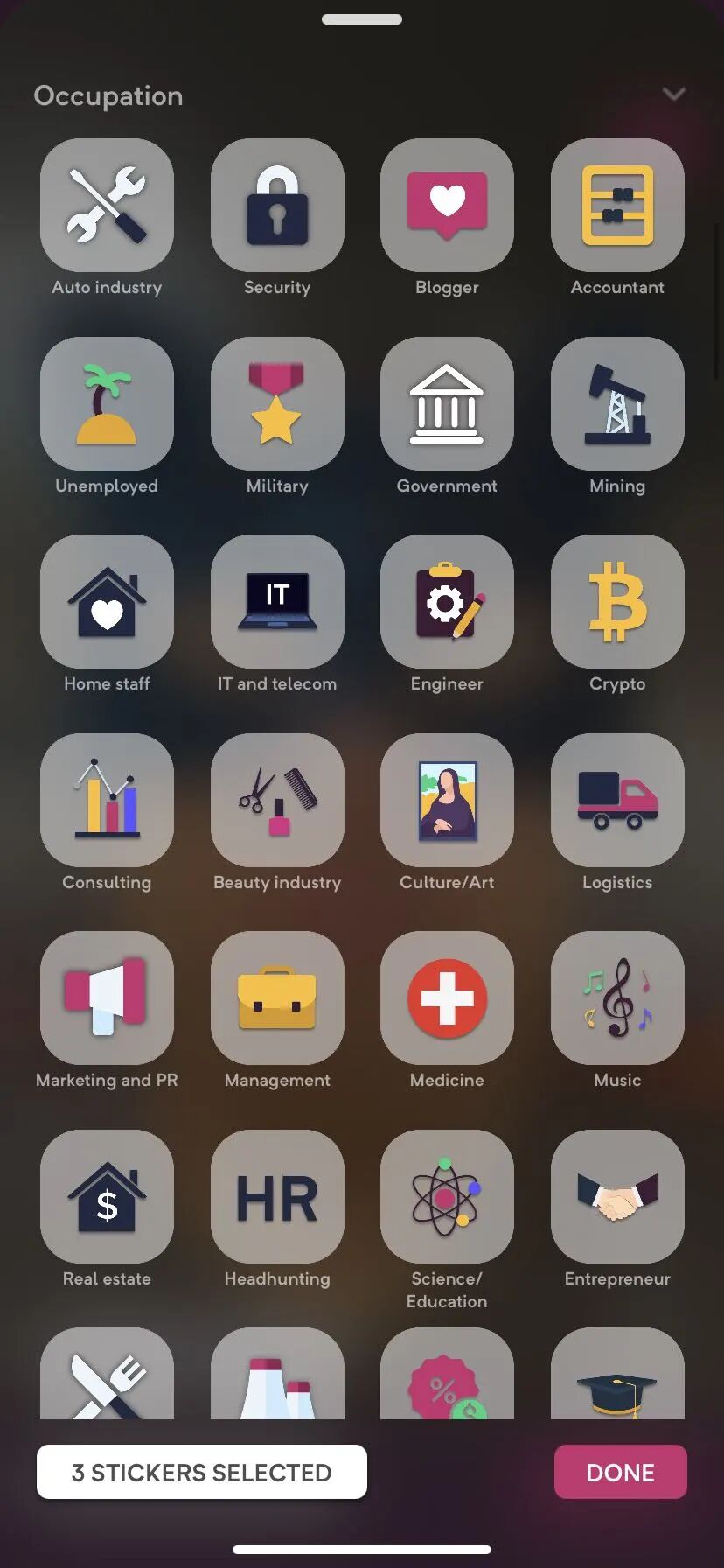 戴上心仪面具后可进行自定义选择Stickers(基本资料标签)。然后就会在首页进行展示了。所有照片和视频均在创建个人资料时拍摄。告别虚假的沉默。