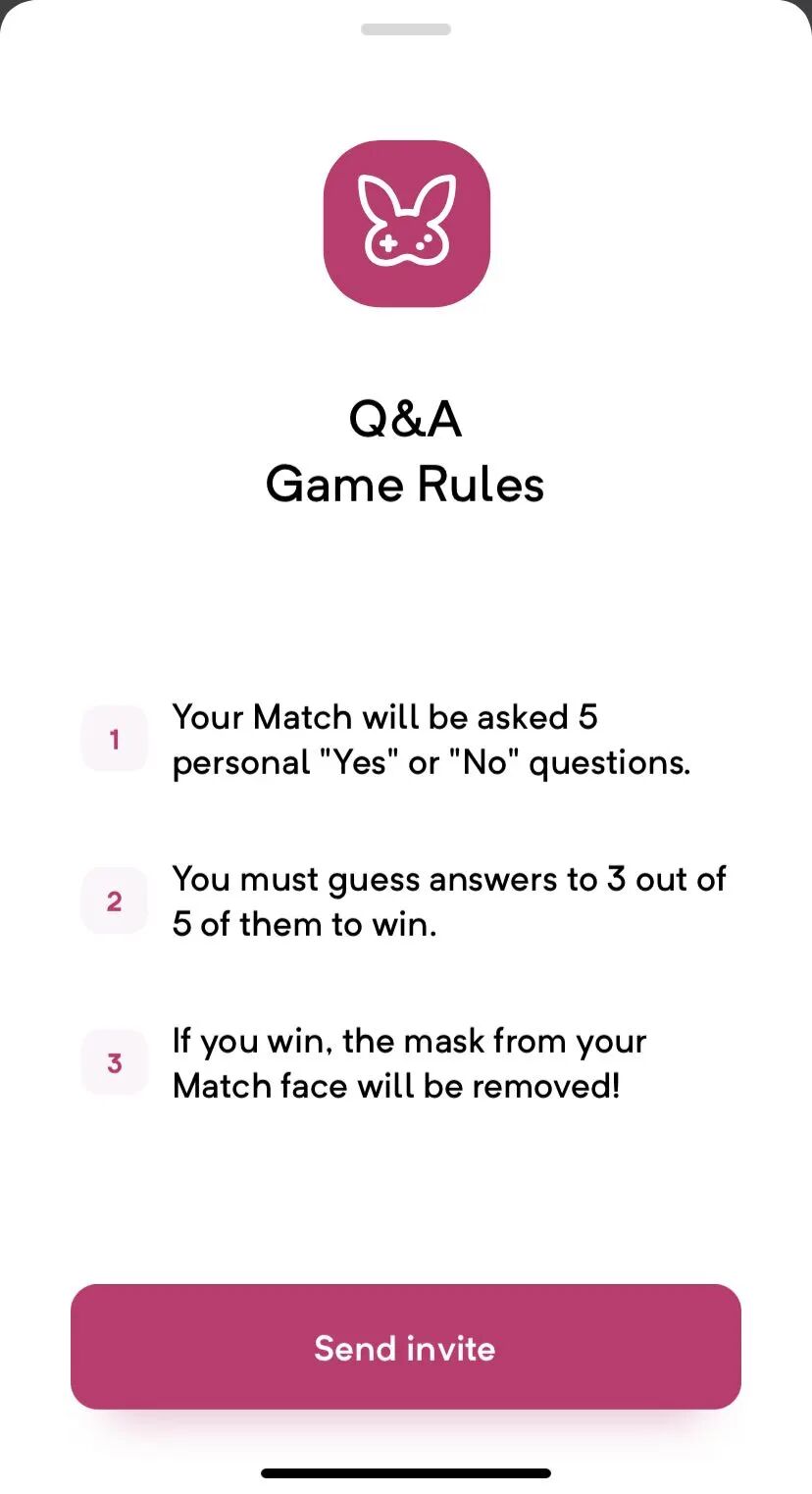 女生注册时先回答五道题,男生需在游戏中 5 局 3 胜(答对 3 道题)才能解锁对方的面具,否则只能等对方自愿摘下。(tips:向对方发送图片会提示你需要先摘下面具才能发送,这也能理解)