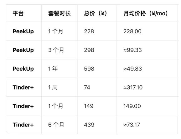 在商业化方面,PeekUp 采用会员付费机制:男生注册后会弹出充值会员、首页滑卡次数限制、以及搭讪限制等。短期会员价格高于 Tinder,但长期会员价格较低,这是典型的定价策略。
