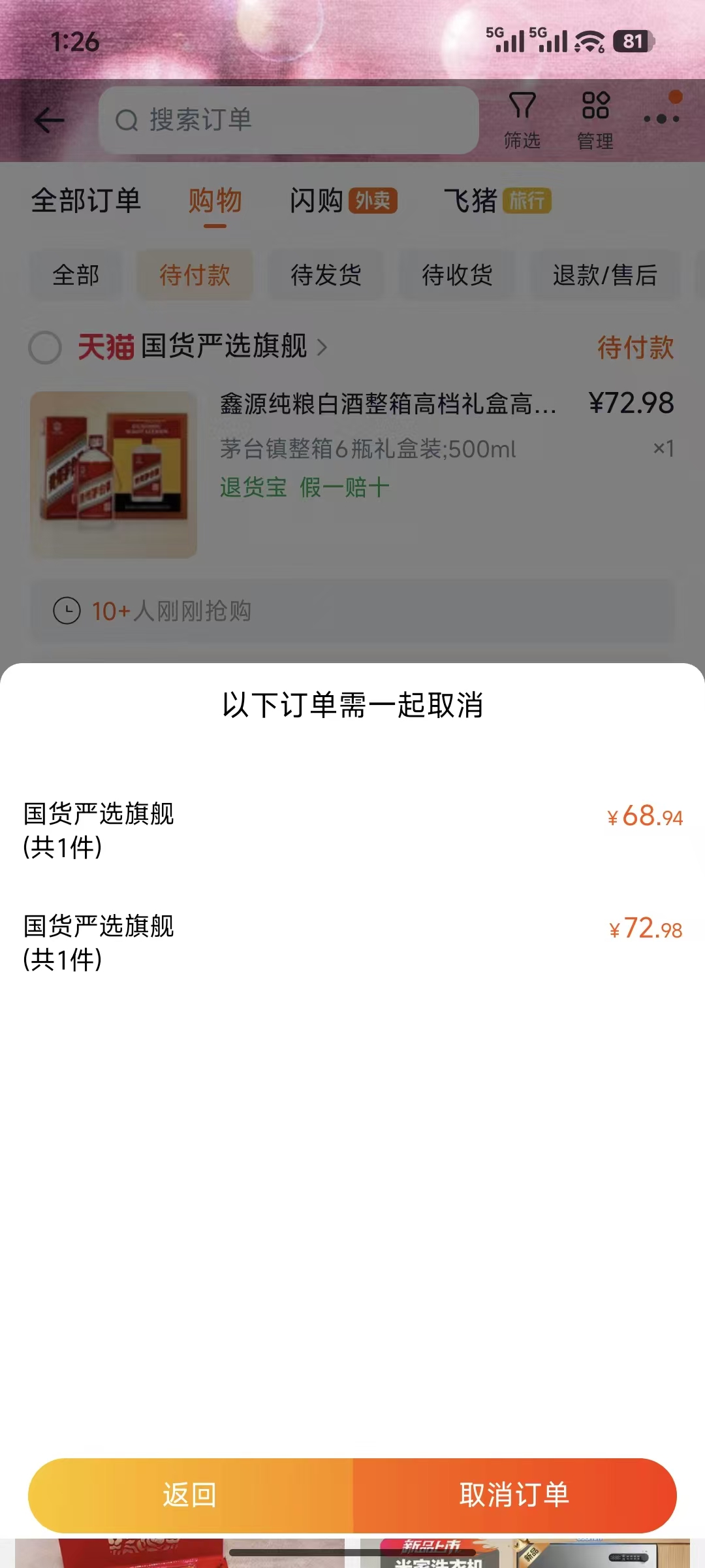 一种是同生共死,返回所有优惠(淘宝),可以在下图看到取消其中一个订单时;他会提示你另一个子订单也用到相应平台优惠需要一起取消,如下图: