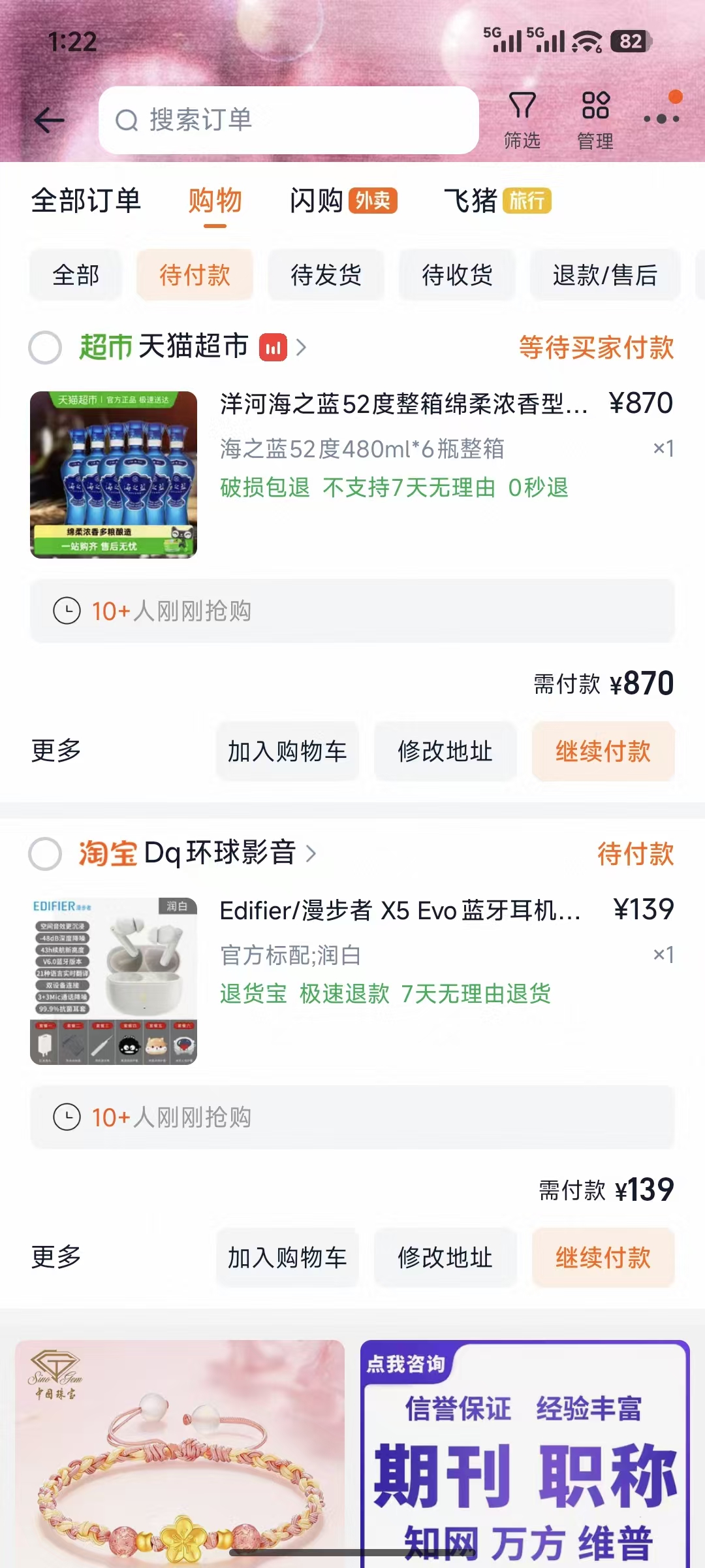 用户在购物车下定多个商品后,进入待付款状态;返回订单列表;你可以看到原本一次支付的订单变成了多个子订单;如果父订单涉及各种优惠将会分摊到每个子订单中;如下图: