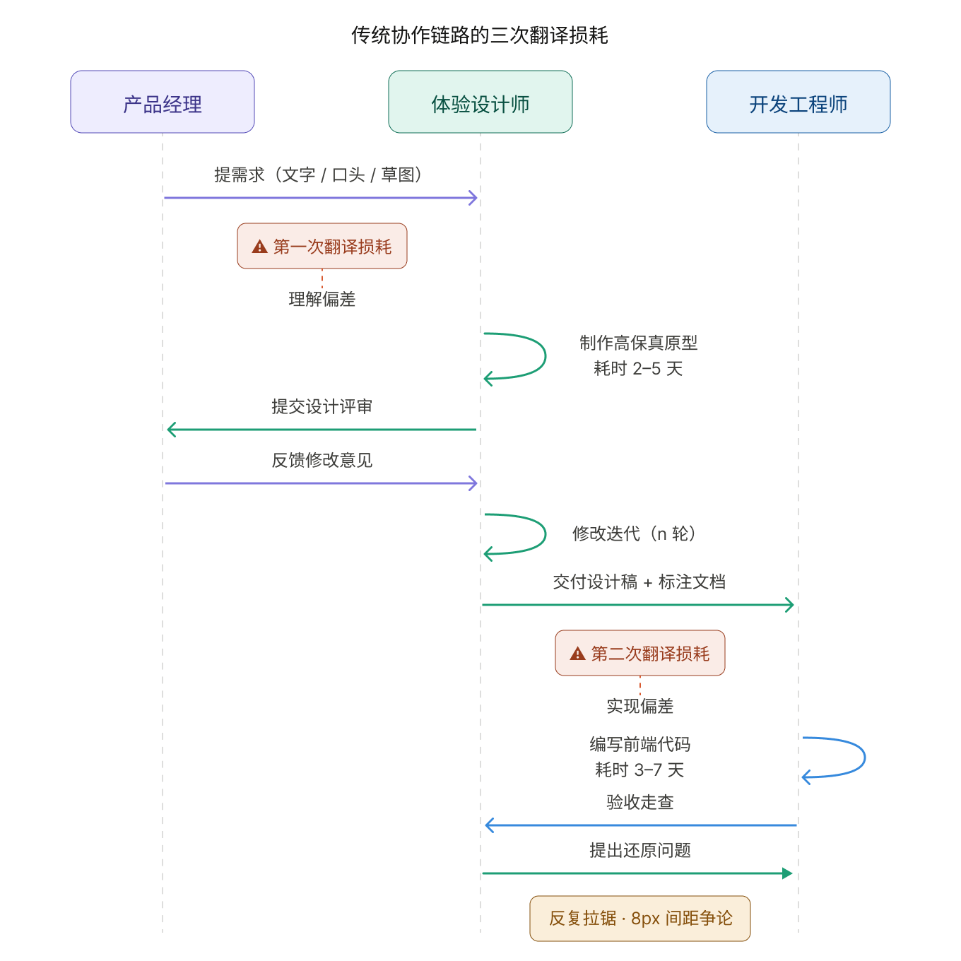 过去,PM、设计、开发之间的协作,本质上是一个多次翻译的游戏。每一次翻译,都需要专业技能,也都伴随着损耗。这也是为什么团队配置很重要——你需要足够多的”翻译者”来保证信息不失真。