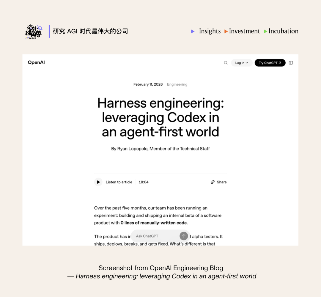 今年 2 月,OpenAI 发布了一篇文章 Harness engineering: leveraging Codex in an agent-first world,描述了一种新的工作方式:工程师不再直接编写代码,而是设计环境、制定规则,让 agent 在其中完成编码。