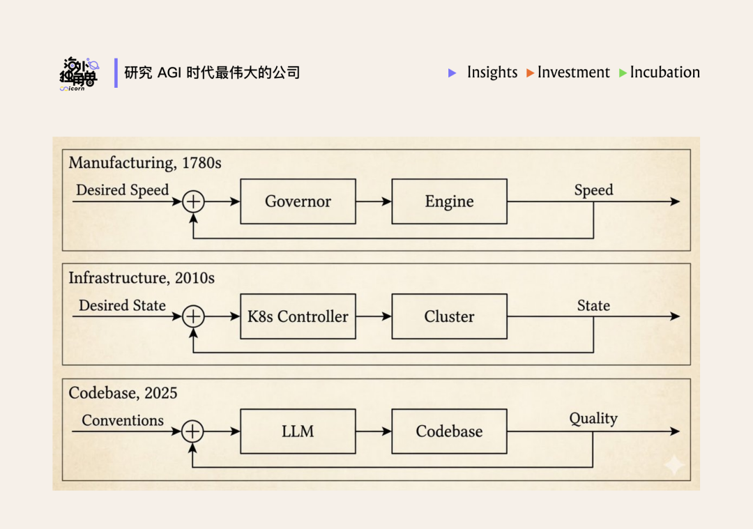 不过,把视野再拉远一点,这种演变其实也并不新鲜。从瓦特的离心调速器,到 Kubernetes 的控制器,工程师的角色早已多次完成类似的转变:从亲手操作系统,变成设计让系统自动运转的机制。1948 年,Norbert Wiener 将这种模式命名为控制论(cybernetics)。