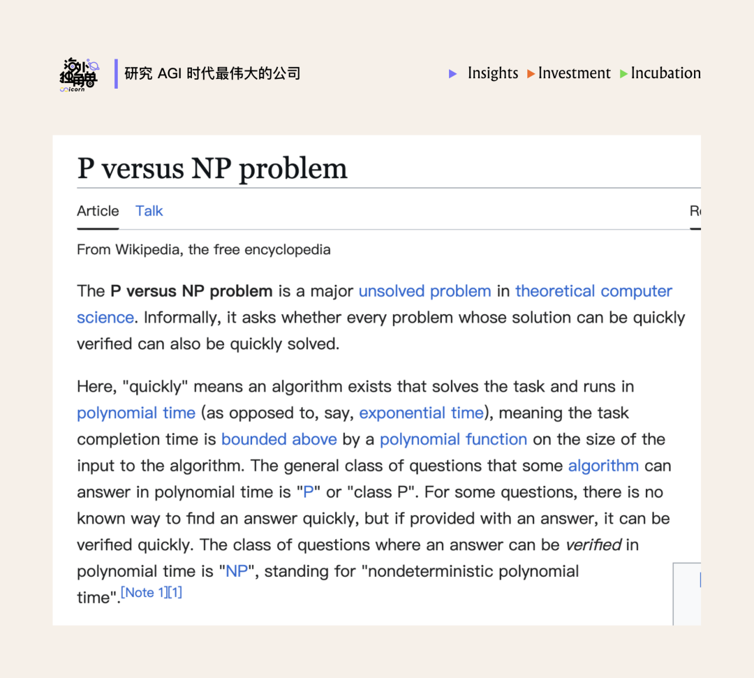P vs NP 问题是计算机科学中一个未解难题:每个能被快速验证的问题(NP 类问题),是否也能被快速求解( P 类问题)。