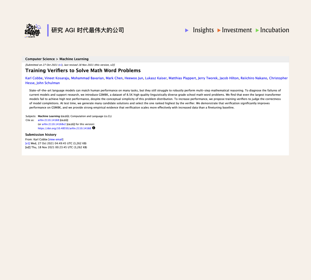 Karl Cobbe 等人在 2021 年 10 月 27 日 在 arXiv 发布了 Training Verifiers to Solve Math Word Problems,实验证明在 LLM 上训练“验证器”用于判断答案正确性要比直接生成正确答案任务更容易,验证方法显著提高了模型在数学应用题上的表现。