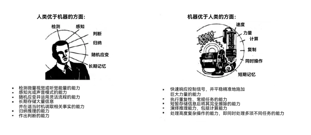 1951 年,保罗·菲茨(Paul Fitts)开展了所谓的“功能分配研究”,旨在明确人机系统中的各项操作该交由哪一方执行。基于当时(远在 Chat – GPT 等出现之前)机器的能力,他提出了”HABA MABA”模型,即“人类更擅长——机器更擅长”模型。1951 年,保罗·菲茨(Paul Fitts)开展了所谓的“功能分配研究”,旨在明确人机系统中的各项操作该交由哪一方执行。基于当时(远在 Chat – GPT 等出现之前)机器的能力,他提出了“HABA MABA”模型,即“人类更擅长——机器更擅长”模型。