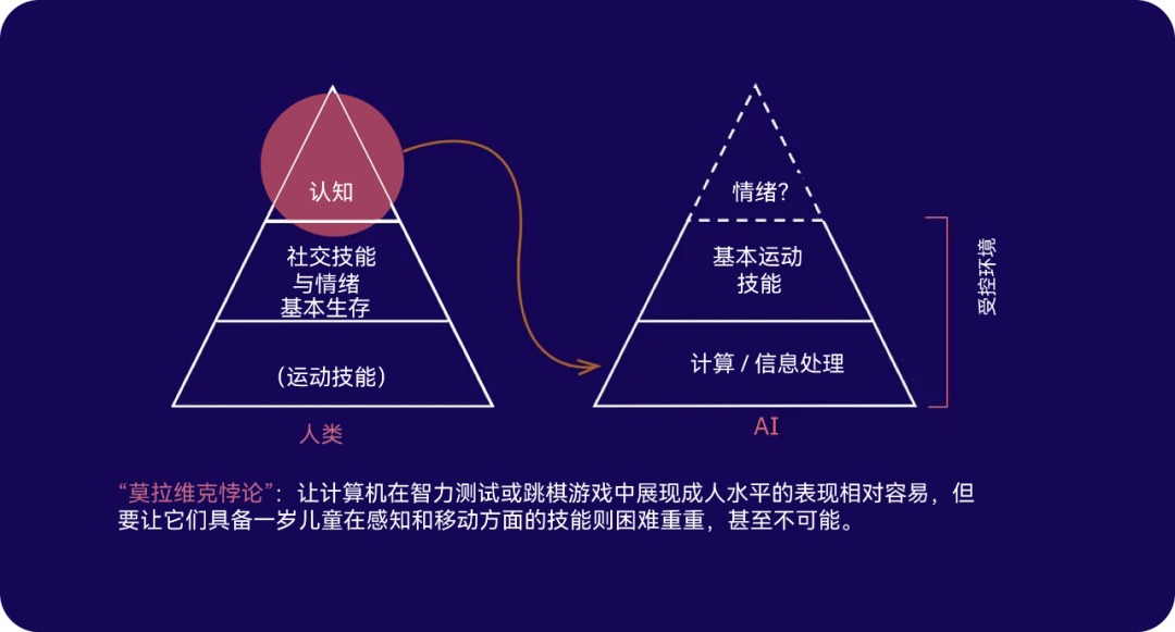 所以,如今的状况是,AI 正在发展那些我们长期以来视为最具“人性”的技能,正是凭借这些技能以及我们的“智慧”天性与智力,人类才区别于其他非人类动物,然而我们却依旧无法将日常生活中最普通的体力常规任务交给 AI。