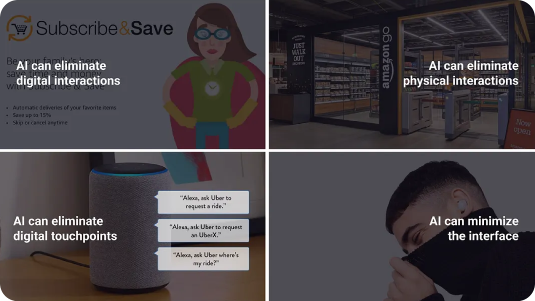 像亚马逊 Go(Amazon Go)所尝试的那样,完全取代人际交互甚至自助服务界面,需要更为复杂的技术和强大的计算能力,而且可能根本无利可图。不过,这呈现出了一个近乎零交互服务的有趣案例。这种新范式对用户链路规划以及服务的透明度和可解释性问题提出了不同要求,由于没有交互,也消除了为客户提供反馈和安抚的机会。