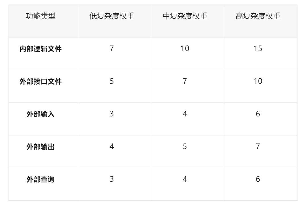应用权重表:使用国际标准(如IFPUG)或组织内部校准过的权重矩阵,将复杂度转换为具体的“未调整功能点数”。