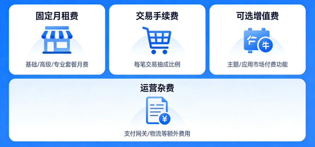 Shopify属于SaaS托管型建站平台,费用透明且分阶,整体成本由4大部分构成: