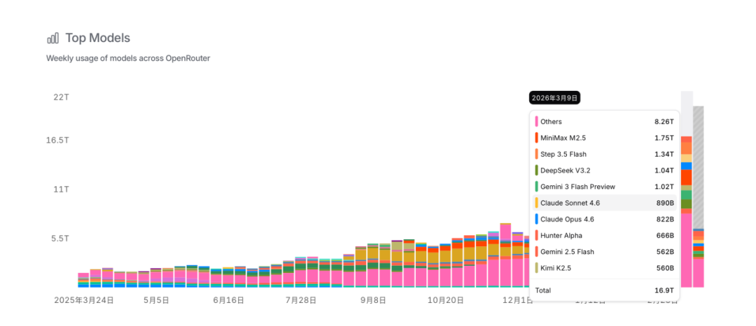 但在2026年3月的某一周中,MiniMax M2.5、阶跃星辰Step 3.5 Flash、DeepSeek V3.2和Kimi K2.5,一周的Token调用量就达到了4.69万亿。