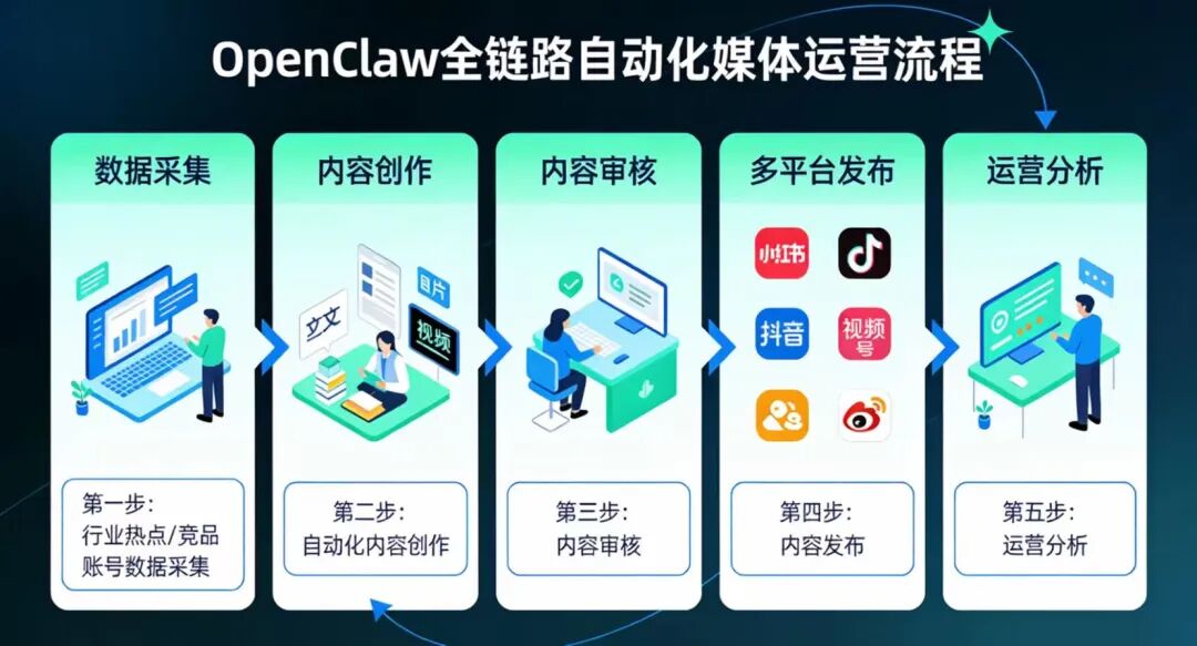 目前我们跑通的一套自动化SOP,主要包含五个环节:选题、创作、审核、分发和复盘。它并不是单纯的内容生成工具,而更接近一套完整的内容运营链路。