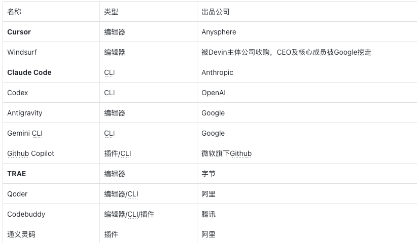 下面表格中列举了国内、国外主流的AI编程工具,他们主要以编辑器IDE、CLI、插件的产品形态存在: