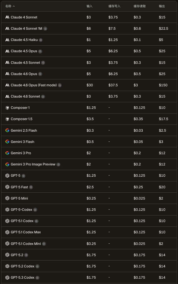 上图是来自Cursor官网,列出了每种主流模型的价格,针对输入、输出、缓存写入、缓存读取是不同的计费价格,从中我们可以发现,每种模型的输出价格最为昂贵,其次是缓存写入、输入,最便宜的是缓存读取。