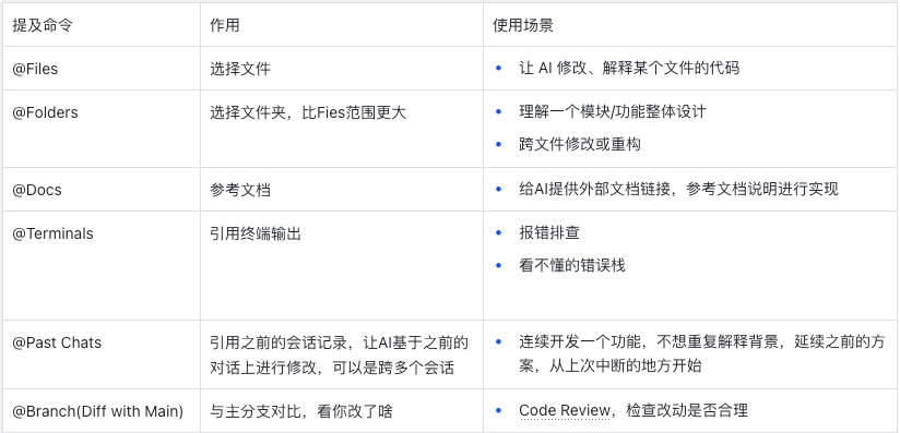 输入框中除了输入文本,我们可以使用快捷键 “@”选择更多的上下文信息,比如项目文件夹、文件、外部参考文档、命令行输出信息、Git分支差异等,具体如下: