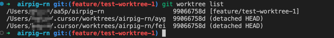 通过在终端运行git worktree list 我们可以看到其实是在用户根路径的.cursor目录下面创建了两个不同的工作区域,从而实现了并行运行且互不干扰,但是这种方式要注意磁盘空间的占用,使用完成后记得及时清理。