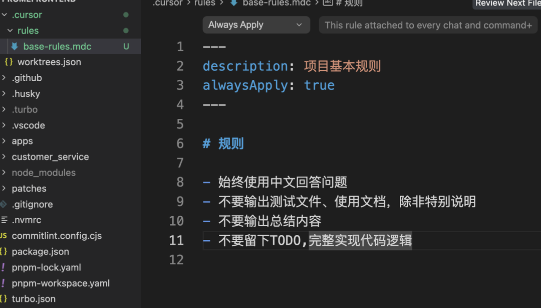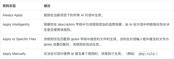 因此我们需要指定规则的生效条件,这里以cursor为例说明,cursor将规则生效方式分为了四种: