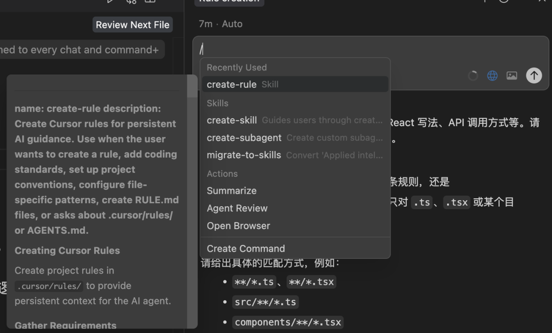 方式三:通过Cursor官方提供的create-rule skill创建,这个skill把官方推荐的rules最佳实践进行了封装,使用也很简单,在聊天窗口中直接输入/creste-rule,然后描述你要创建规则内容以及生效方式即可。
