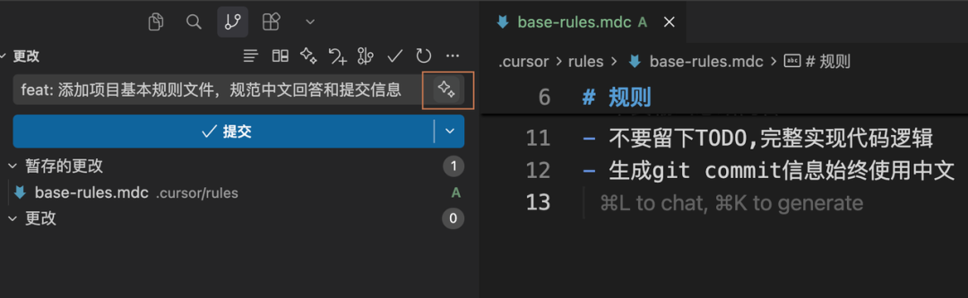 并且现在的编辑器基本都支持基于修改的文件内容自动生成commit message,非常方便,而且还非常语义化,不用像之前绞尽脑汁的去想应该写什么内容,或者干脆写一句毫无信息量的“修改文件”。