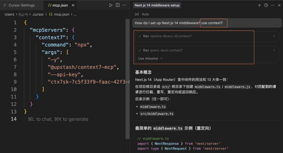 使用方式如下,以Cursor为例,在我们的提示中加入use context7即可,它会自动去调用相关的工具获取最新的文档信息。