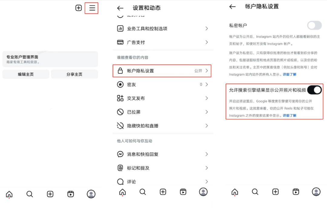 点击右上角三横线,进入【设置和动态】一【账户隐私设置】一【允许搜索引擎结果显示公开照片和视频】,这样设置之后,Instagram帖子就可以通过Google搜索被发现,相当于为企业提高了一个新的营销渠道的,为企业提供了额外的曝光机会。