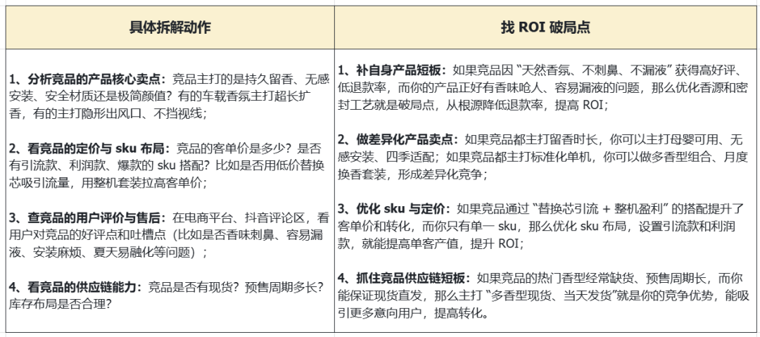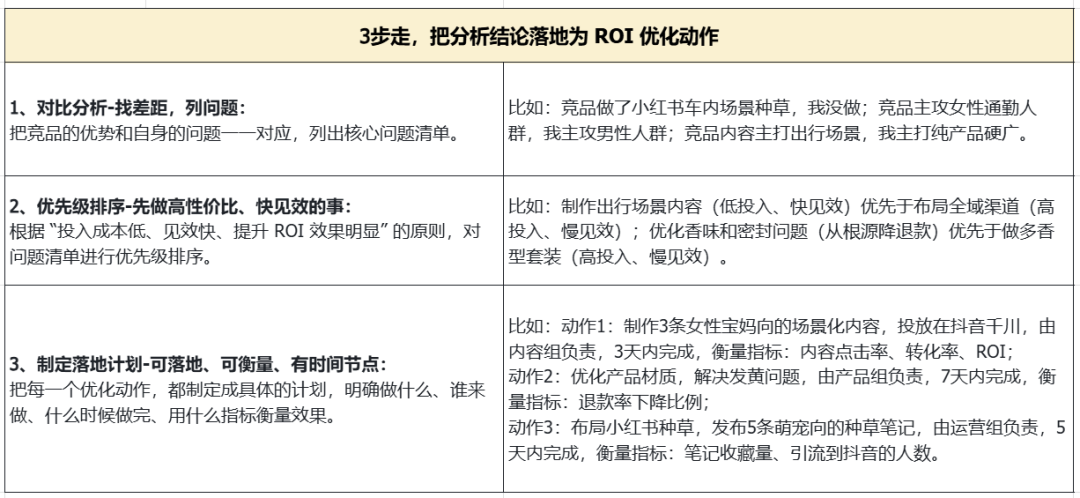 做竞品分析的最终目的,是落地为具体的优化动作,提升 ROI。很多商家分析完竞品,得出了一堆结论,却不知道怎么落地,最终不了了之。