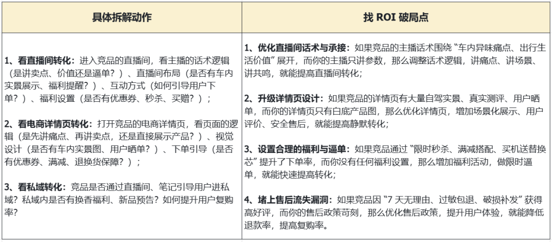 核心问题:竞品的转化环节(直播间、详情页、话术)有什么亮点?哪些环节存在流失漏洞?我们能优化自身的转化环节吗?