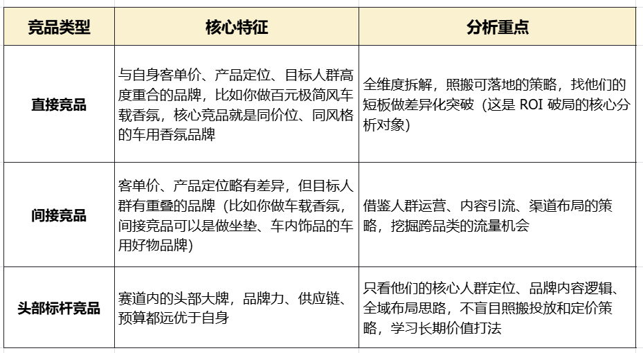 根据与自身品牌的匹配度,把竞品分为3类,不同类型的竞品,分析重点不同,避免盲目对标头部大牌: