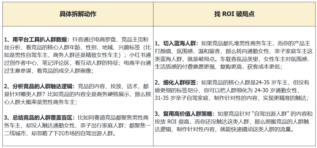 比如复用竞品的 “场景化内容逻辑”,但结合自身的产品卖点,做不同的场景;复用竞品的 “蓝海人群触达逻辑”,但制作更精准的内容。