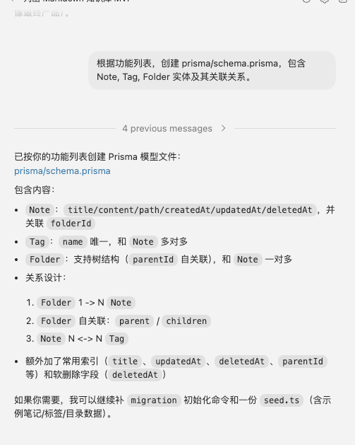 预期结果:AI 将梳理出 MVP 核心功能(如笔记的创建、编辑、分类等),并生成一份项目专属的 .cursorrules 文件,规范后续 AI 生成代码的风格。